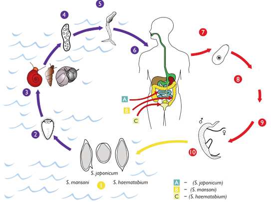 Hol to guje e bamɗi kooñolli koɗata ? Ɗi koɗata ko e ɗiiɗoo nokkuuji : beeli, mbeelon, caaɗli, tufle, pokpokalam, hawngooji uddooji, gaawi, kañum e boyli. Hol no ɗi mbiltirta ? Ɗi nguuri ko e daawal ƴiiƴewal neɗɗo. So gorko hoolñii debbo oo, oon e holño mum e peewfe mum ɓoccina ujunere ɓoccoonde e nder ñalawma. Mborosaaji ɗii mbirnoyoo e ɗaɗol heeñere. Ko ɗoon ɗi ŋabbirta feewde ɗaɗol wiiseer. Mboros ɓuuɓri ƴiiƴewal, oon rewata ko e kappileer taartaari wofnde, haa yettoo wofnde. Ɗeen ɓoccooɗe so njettiima wofnde, eɗi njalta e kaaye soko tawii neɗɗo soofii. Ɗeen ɓoccooɗe mbaawata wofaade ko e ndiyam mbelɗam. Goofagol ɓoccooɗe ɗee fawii ko e diƴƴe, tawa nguleeki ndiyam ɗam tolnii ko e 25°, tawa kadi nokku oo ina yiya naange. E nder balɗe tati, ɓoccoonde ndee toccina mburɓutel (miracidium). E nder balɗe ɗiɗi, so mburɓulel ngel dañaani wujo walla mbabba hooñoldu, ngel maayat. So ngel dañii wujo walla mbabba hooñoldu, ngel naata e nder mum, ngel wayloo e nder mum, e sifaa eddaaji ɗiɗi : mo gadano e mo ɗimmo. Ngel mawnata ko e nder heeñere e (baggol) pankereyaa mum, ngel yaltira sifaa mburɓulal (flikoseerker). Ɗoo, ngel sifortee ko no annama faaɓru ndu laacel ceeɓngel. Wujo e mbabba hooñoldu fof ñawndu, ina njaltina heen, e nder ñalawma, ujunnaaje joy. So woodi garɗo yarde walla lootaade, ɗi naata e nder nguru ɓalndu mum. So ɗi naatii e nder nguru neɗɗo oo, ɗi ngonta mburɓaaji (schistosomul). E nder hojomaaji sappo, ɗi naata e nder ƴiiƴam, ɗi ndewa to ɓernde bannge ñaamo, ɗi ɓenna to bumsuɗe. Caggal ɗuum, ɗi ngarta e ɓernde to bannge nano, caggal ɗuum, e nder daawal ƴiiƴewal. Ɗoon noon ɗi kucca e ɗaɗol heeñere, ko ɗoo ɗi mawnata, ɗi pillittoo nguurndam majji. So ɗi njeettiima ɗaɗol heeñere, ɗi ndaaŋana ɗaɗi wofnde. Ko ɗoon debbi ɗii ɓoccinta. Oon tuma, so neɗɗo oo taariima, ɓoccooɗe ɗee ina njalta e kaaye mum