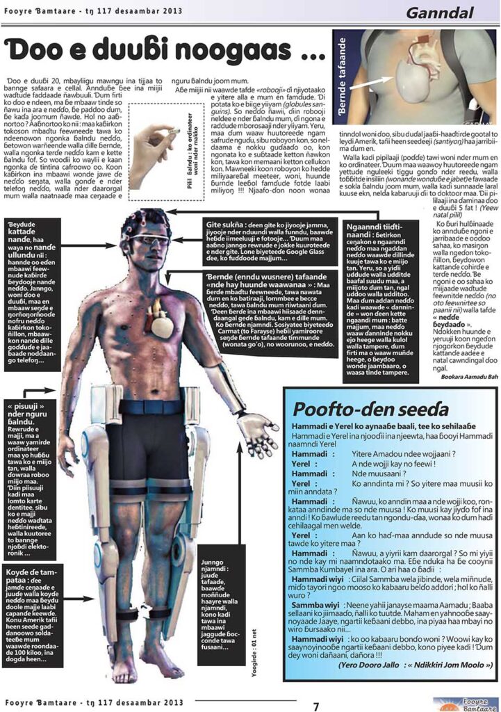 Aɓe miijii nii waawde tafde «robooji» ɗi njiyotaako e yitere alla e mum en famɗude. Ɗi potata ko e biige ƴiiƴam (globules sanguins). So neɗɗo ñawii, ɗiin robooji neldee e nder ɓalndu mum, ɗi ngona e raddude mborosaaji nder ƴiiƴam. Yeru, maa ɗum waaw huutoreede ngam safrude nguɗu, sibu roboyon kon, so neldaama e nokku guɗaaɗo oo, kon ngonata ko e suɓtaade ketton ñawkon kon, tawa kon memaani ketton cellukon kon. Mawneeki koon roboyon ko hedde miliyaareɓal meeteer, woni, huunde ɓurnde leeɓol famɗude fotde laabi miliyoŋ !!! Njaafo-ɗon noon wonaa tinndol woni ɗoo, sibu duɗal jaaɓi-haaɗtirde gootal to leydi Amerik, tafii heen seedeeji (santiyoŋ) haa jarribiima ɗum en. Walla kadi pipilaaji (poɗɗe) tawi woni nder mum en ko ordinateer.