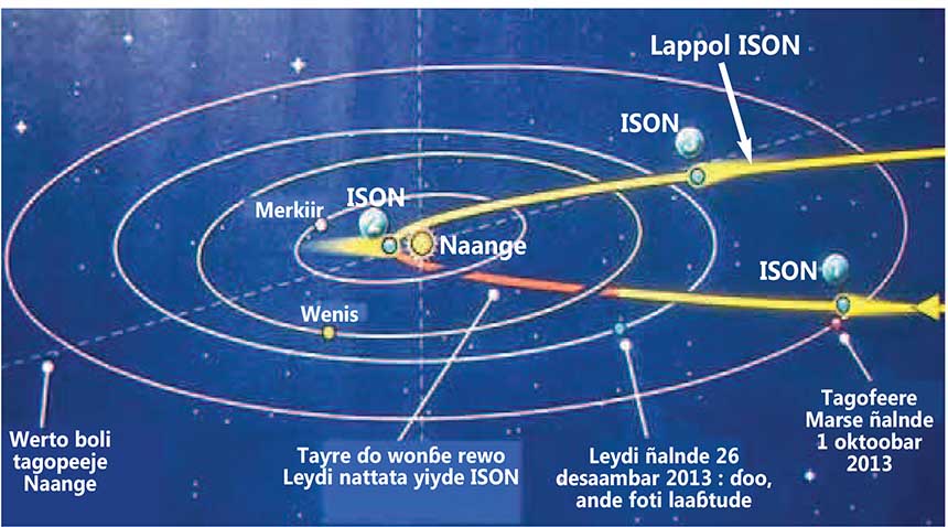 So a reenaaki, hoore ISON ɓoroto. Hol ko ɓorata ɗum ? Ɓorata ɗum ko nguleeki naange, sibu ko galaas fottata ɗoon e jaynge. Maa wonii ISON fusii, walla mbiyen saayii, maa wonii, so nde daɗii heen, nde yahda e annoore mawnde no feewi. Oon sahaa, so nde daɗii heen (koode-laaci keewɗe ndaɗii heen), ma nde yayno haa mbaawen seedoraade yitere mehre so nde reftii saraaji Leydi men ndii ñalnde 26 desaambar 2013. Oon sahaa 64 miliyoŋ kiloomeeteer ina ɓilii hakkunde men e mayre. Caggal ɗuum, ñalnde 14 e 15 saawiyee 2014, maa Leydi men ndii rew saraaji bolol mayre. Oon sahaa eɗen mbaawi yiyde “punndi” mayre, ɗum woni ko mbiyaten “koode ciirtotooɗe” koo. En mbiyiino wonde hoodere laaci-Halley yillotoo en ko laawol gootol duuɓi 76 fof, ndeke Halley ina heewi e men koyɗe. Waɗi en wiyde noon, ko ISON yillotoo en ko laawol gootol duuɓi 900 000 kala !!!