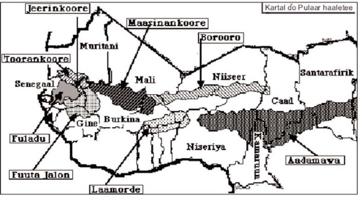 Sabaabu caragol Fulɓe e nder Afrik, e nder denndaangal nokkuuji ɗi limtu-ɗen dow ɗi, hakkunde Maayo Nil e Geec Atlantik, ko yiilaade ɓe ko ɓe nguurdi, e ko ɓe nguurniri nayi maɓɓe, sabu ko e majji tan ɓe ndewi, eɓe ɗaɓɓa ndiyam e huɗo. Ko ɗum addani ɓe hoɗde ko juuti e nder ngenndiiji maantinɗi : hono Fuuta Tooro, e Maasina, e Fuuta Jaloo, e Liɓotaako (Liptaako), e Aadamaawal…