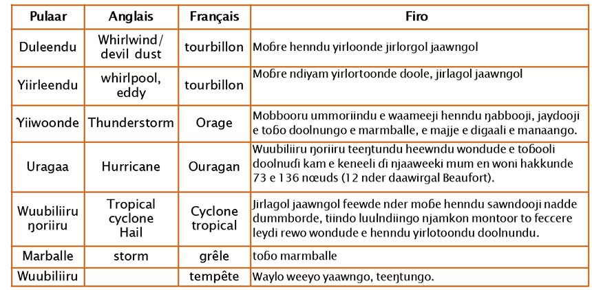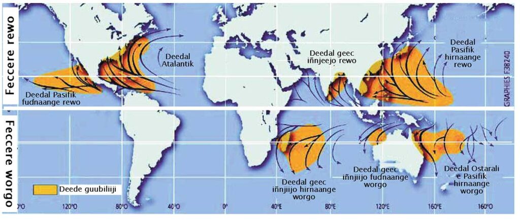 Guubiliiji ina njogii inɗe keewɗe e fawaade e deedal guubiliiwal ɗo ɗi nguttata ɗoo. Nii woni, helmere Wuubiliiru (walla wuubiliiru ŋoriiru) herorii ɗum tan ko geec iñnjeejo e pasifiijo worgo. So tawii ko to Atlantik rewo walla to Pasifik rewo guubiliiji ɗii mbiyetee ko Uragaa (Ouragan); so tawii noon ko to Pasifik hirnaange rewo wiyee Tifoŋ (typhon).
