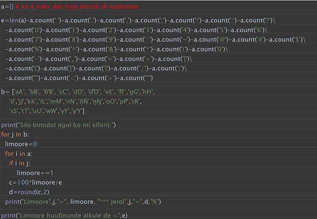 Wadde en njiyii ko “a” ardii, artere mum ko 14,33%. Rewi heen “e”, 11,32%. Jokkiri noon.