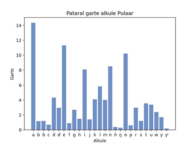 Teskuya ngoɗka ka mbaaw-ɗen waɗde ko dow alkule tati ɓurɗe waasde huutoreede ɗee: ñ (0,40%), ŋ (0, 30%) e ƴ (0,19%). Ɗoon ɗo nder ujunnaaje sappo (10000) alkulal kuutorangal fof, alkulal “a” ina yalta heen laabi 1433, alkulal “ƴ” yaltata heen tan ko laabi 19, ŋ yalta heen laabi 30, ñ yalta heen laabi 40. Ɗee-ɗoo kelme tati mbayi kono kuutoraaka nii e Pulaar, so yerondiraama e kelme goɗɗe ɗee. Kono kadi alkule “c, p, f, b” ina mbetti-mi no feewi e pamaram kuutorogol mumen.