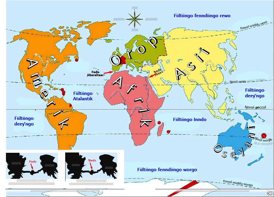 E ko nganndu-ɗen, kala wertallo ndiyam kaaɗɗam, wiyetee walla wiyetenoo ko geec. Ine gasa tawa ko noon wonande renndooji keddiiɗi ɗii. Eɗen nganndi kam, wonande oropnaaɓe, kala wertallo ndiyam kaaɗɗam wiyetenoo ko « mer », tee ɓurnoongo heen yaajde ngoo wiyetenoo ko « mer océane » (geec piilto). Ko kanngo Chistophe Colomb (Kiristof Kolombo) taccunoo. Nde biyeteeɗo Magellan yiyti « fiiltiingo mawngo » (grand océan), o tawi ine deeƴi, o inniri ngo « océan pacifique » (Fiiltiingo deeƴngo). Ko ndeen « fiiltiingo Atalantik », « fiiltiingo Deeƴngo », caggal ɗuum « fiiltiingo Inndo », « fiiltiingo Austral » e « fiiltiingo Arctique » puɗɗii feeñde he karte.
