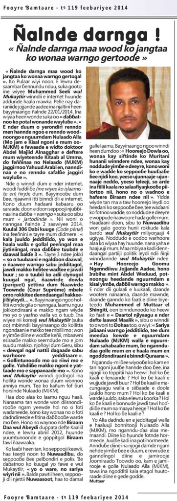 « Ñalnde darnga maa wood ko jangtaa ko wonaa warngo gertogal ». Ko Pulaar wiyi noon. E lewru desaambar ɓennundu nduu, suka gooto ine wiyee Muhammed Seek wul Mukaytiir winndii e internet huunde addunde haala mawka. Pelle nay daraniiɗe jojjanɗe aadee ina njaltini heen bayyinaango ñalnde 22/01/2014. Ina wiyaa heen wonde suka oo « ɗaɓɓatnoo ko potal wonande wayluɓe ». « E nder ɗuum o yerondiri renndo men hannde ngoo e renndo woodnoongo e nguurndam Nulaaɗo Alla (Mo jam e Kisal ngoni e mum ooMJKM) e fawaade e wiɗto doktoor Abdel Majiid Alnagghar e deftere mum wiyeteende Kitaab al Umma, ɗo feññinaa no Nelaaɗo (MJKM) jaggirnoo Yahuud Arabi en, nanndinaa e no renndo safalɓe jaggiri wayluɓe »