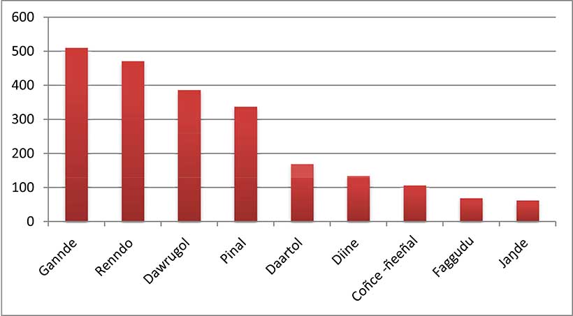 E nder ɗii duuɓi 15 ko fooyre fuɗɗitii yaltude, jaaynde ndee naatnii fotde 21 960 947 MRO (hedde 117 243 MRO lewru kala), tawi heen 45% ko njeeygu jaaynde ndee (waɗde hakindo njeeygu nguu ko hedde 300 tumbitere lewru kala). Nii woni fotde 200 tumbitere ine lammba, so tawii ko 500 hebbitinaa. Ndeke njeeygu nguu ine leefi sanne. Lulnagol ngol (kaayit e limnere) ko 13% tawi 4% ko e sifaa limnere (pdf), ndeke ine leefi tawo, ndeke hirjino ine foti kadi semmbineede e ngoon yeeso.