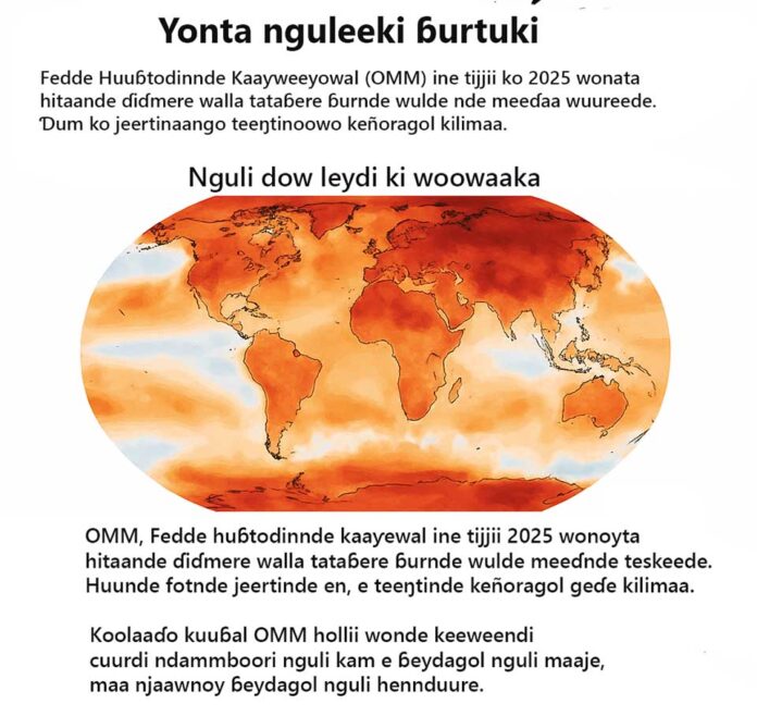E wiyde e World Meteorological Organization (WMO), hono Fedde Huuɓtodinnde Kaaƴweeyowal, hitaande 2025 ndee jeyaa ko e kitaale ɓurɗe wulde ɗe aduna oo meeɗi wuurde. Kaa haala tuugii ko ɓeto nguleeki ƴettaango. Hakingo ngoon ɓeto e winndere ndee ɓurii +1,42 C° ko adii yonta mbaylaandi. Saabii ndee teeɗannde hulɓiniinde ko gukkitte ɓurtuɗe cuurdi ƴulɓiri (Gaz carbonique), e ɓeydagol nguli maaje.
